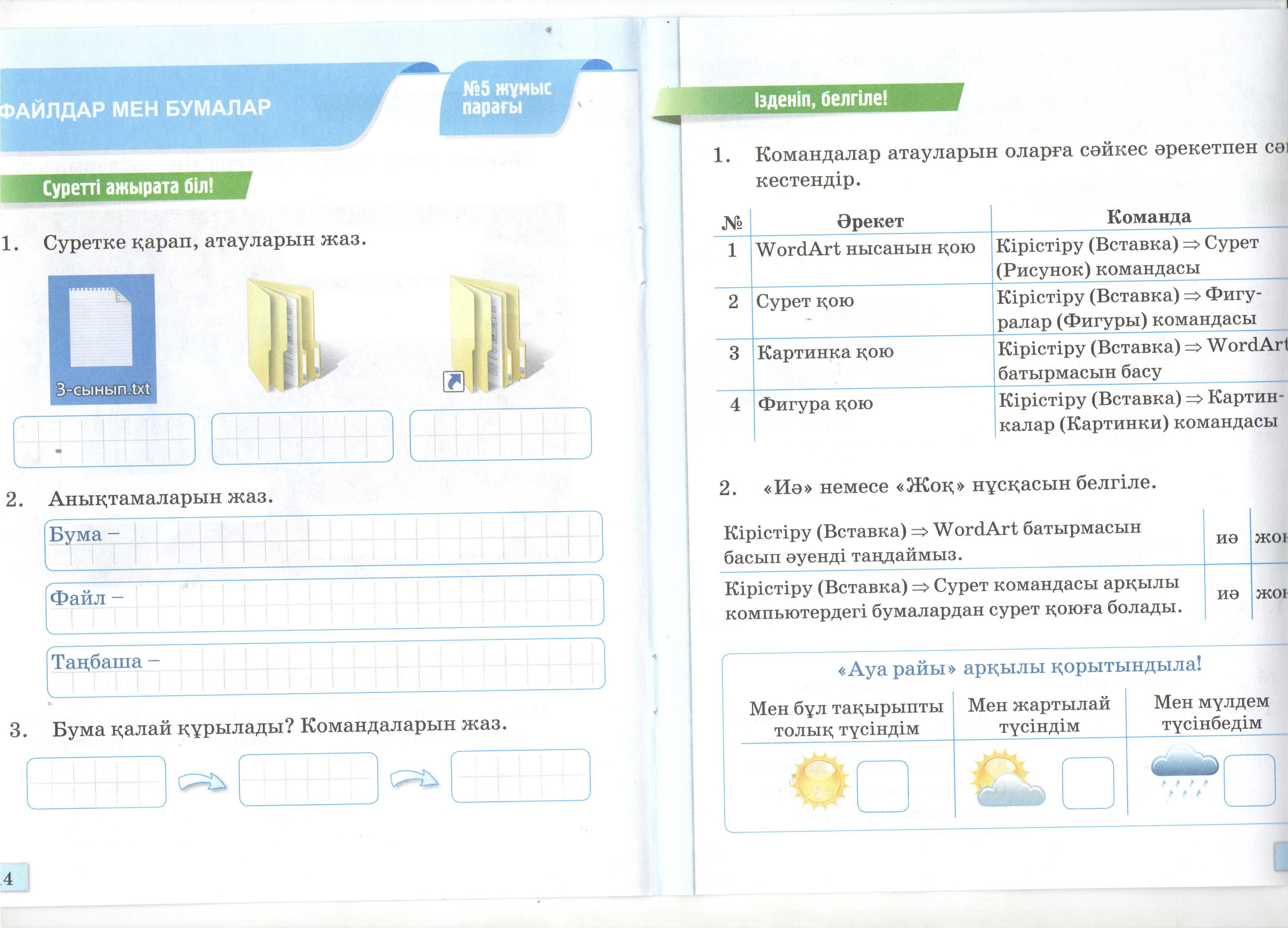 3.1.3.1 Цифрлық құрылғыларменжұмысжасауда қауіпсіздік техникасының негізгі ережелерін сақтау 3.1.2.1 компьютерлік программалар қолданушының міндеттерін шешу үшін қажет екенін түсіндіру 3.1.1.1 Енгізу (мысалы, тінтуір, пернетақта) және шығару құрылғыларын (мысалы, монитор мен принтер) ажырату 3.1.2.3 Файл және бума, таңбаша ұғымдарын түсіндіру |