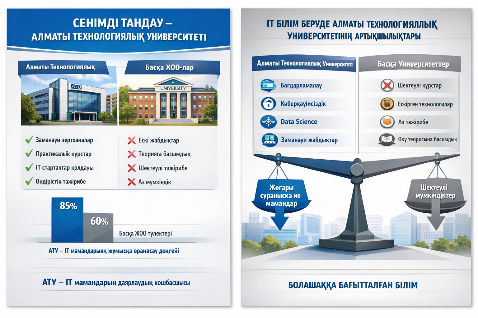 This article discusses the educational opportunities of Almaty Technological University in the field of IT. The modern educational system of the university, its role in mastering digital technologies and its contribution to the professional development of students are analyzed. In addition, the advantages of training in the direction of Information Technology and the problems of demand in the labor market will be covered. As a result of the study, the importance of Almaty Technological University in the training of IT specialists is revealed and it is proved that it is a future-oriented educational environment.