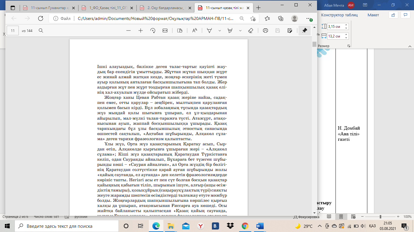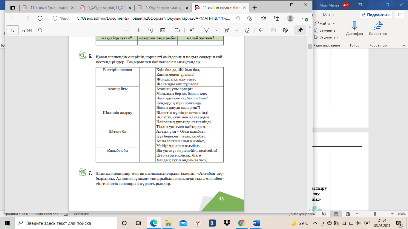 Бөлім: Қазақстан бүгінгі әлемде: Қазақстанның өткені мен келешегі. |