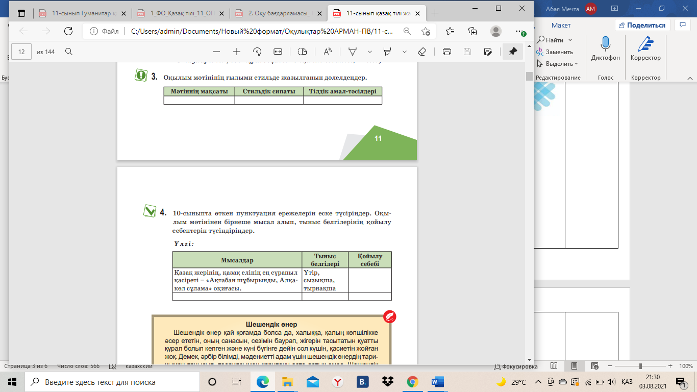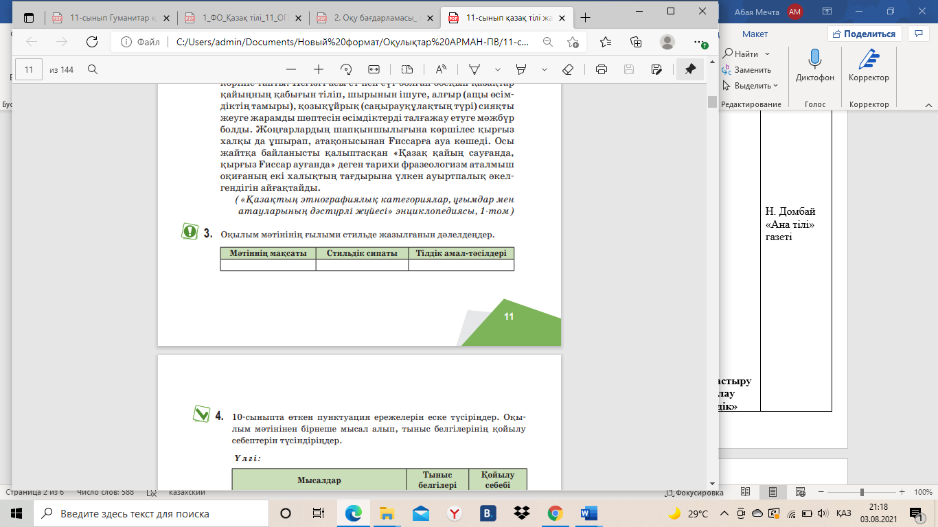 11.2.2.1 - таза ғылыми стильді тілдік құралдар арқылы тану (терминдер, ұғымдар, шартты белгілер, синтаксистік құрылымы); 11.4.5.1 - мәтін және мәтін үзінділері деңгейінде тыныс белгілерін қолдана білу. |
