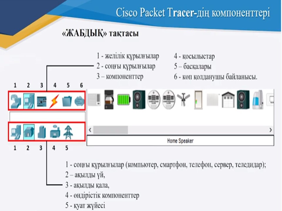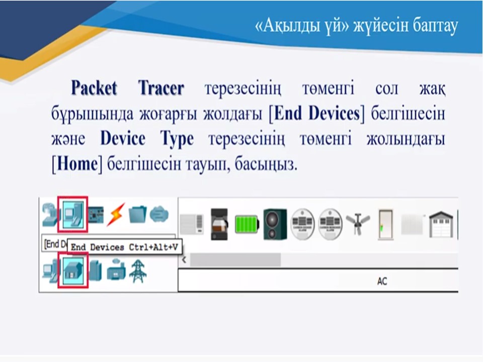 Packet tracer терезесінің төменгі сол жақ бұрышында жоғары жолдағы соңғы құрылғылар белгішесін және құрылғылар терезесінің төменгі жолындағы үй белгішесін тауып, басамыз.