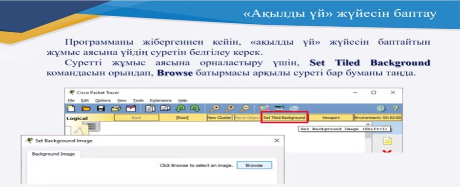 Программаны жібергеннен кейін ақылды үй жүйесінің жұмыс аясына үйдің суретін белгілеу керек. Суретті жұмыс аясына орналастыру үшін Set Tiled Background