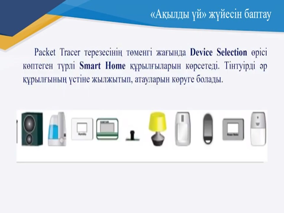Packet Tracer терезесінің төменгі жағында құрылғы таңдау өрісі ақылды үй құрылғыларының көптеген түрлерін көрсетеді. Тінтуірді әр құрылғының үстіне жылжытып, атауларын көруге болады. Құрылғыны таңдау терезесінің төменгі жағында құрылғының сипаттамалық атауы пайда болғанын байқаймыз. Бір сәтте уақыт бөліп, құрылғының әр түрін қарап, шығуыңызға болады.