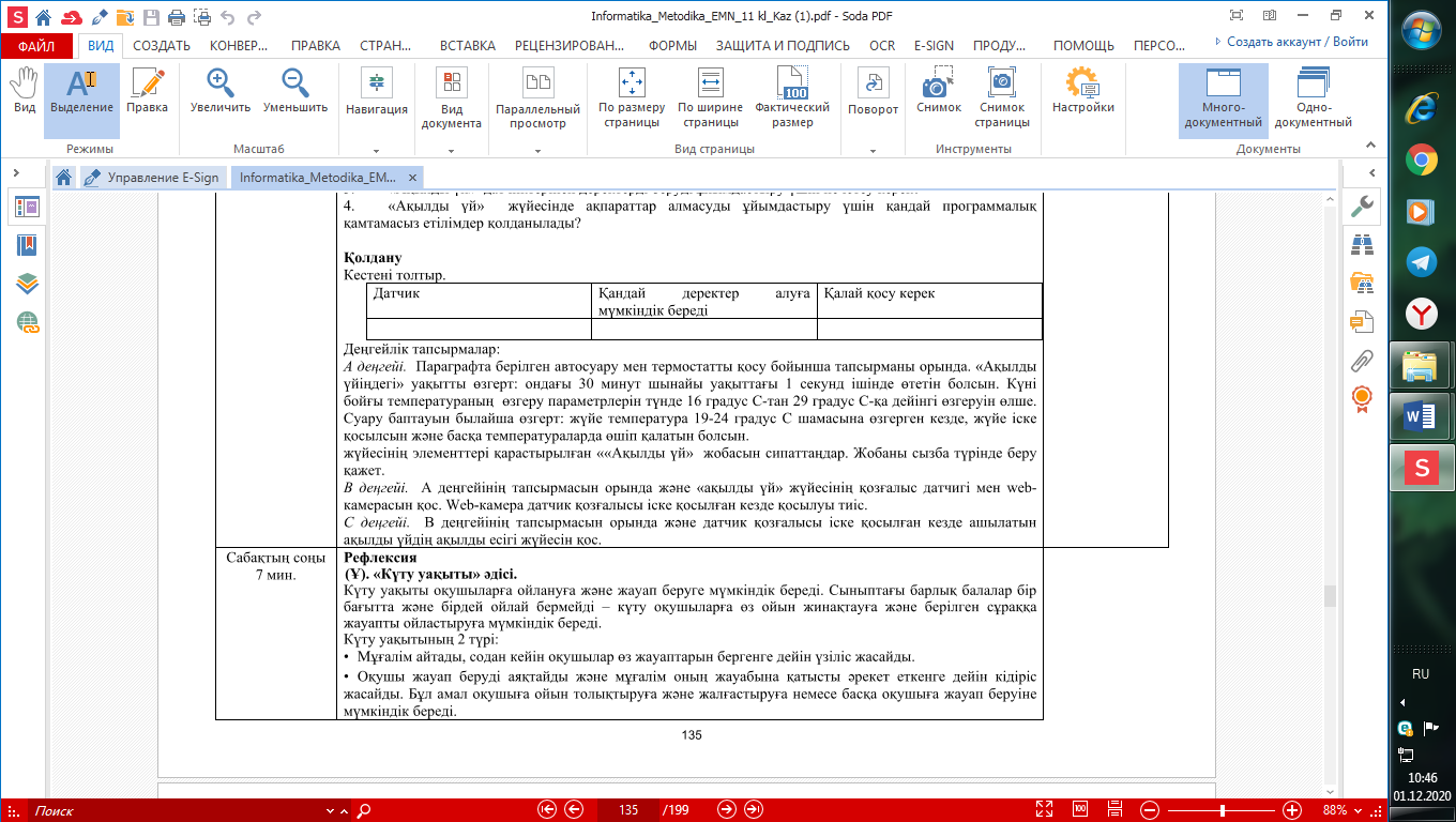 Педагог сабақтың мақсаттарымен таныстырады: «ақылды» үй датчиктерінен алынған деректерді шығаруға арналған программаны қалай әзірлеу; «ақылды» үй құрылғыларын басқаруға арналған программаны қалай әзірлеу керектігін білетін боласыңдар. Оқулықпен жұмыс Ақпаратты «Инсерт» әдісі бойынша оқу. Топтағы оқушылар мәтінді оқып, арнайы белгі қойып отырады: + - мұны білемін; – - мен басқаша ойлағанмын, бұл менің ойлағаныма қарама-қарсы болып шықты; v – мен үшін бұл жаңа нәрсе; ? – маған бұл түсініксіз, түсіндіру, нақтылау қажет. Топтың спикері оқылған нәрсенің мәнін түсіндіреді. Мұғалім оқушылармен сөйлеседі. Мәтіннің түсініксіз жерлерін түсіндіреді. Cisto Packet Tracer программасымен танысу. Программалық құрылғыға шолу жасау. ПҚ сілтемелер бойынша орнатуға ұсыныстар: Программа интерфейсін зерттеу 1 – мәзір жолағы 2 – баптау беті 3 – компоненттерді таңдау 4 – таңдалған компоненттің элементтері 5 – элементпен жұмыс жасауға арналған құралдар панелі 6 – жұмыс аясы Үй компоненттері элементіне шолу «Ақылды үй» жүйесін баптайтын жұмыс аясына үйдің суретін белгілеу керек. Үйдің суретін сайт атауы сілтемесі бойынша табуға болады: Set Tiled Background басып, Browse көмегімен суретті таңдау. 1. Үйде сымсыз желімен басқару үшін, Home Gateway шлюзін орналастыру. 2. Телефон – «ақылды үй» жүйесін басқару үшін. 3. Термостат 4. Автосуару құрылғысы Осылайша Cisco Packet Tracer программасын қолданып, «ақылды үйіңнің» қажетті құрылғыларын баптай аласың. Құрылғыларды басқару үшін қажетті бұйрықтарды бересің. Шлюзді баптау Оқулықтағы суреттер. Шлюз бойынша шертсең, оның баптау терезесі ашылады. Config бетіндегі Displau Name атауын Home Gateway-ге өзгерт. Білу және түсіну 1. «Ақылды үй» жүйесінде бақылаушылар не үшін керек? 2. «Ақылды үй» жүйесінің датчиктері қандай қызмет атқарады? 3. «Ақылды үй» датчиктерінен деректерді беруді ұйымдастыру үшін не істеу керек? 4. «Ақылды үй» жүйесінде ақпараттар алмасуды ұйымдастыру үшін қандай программалық қамтамасыз етілімдер қолданылады? Қолдану Кестені толтыр.