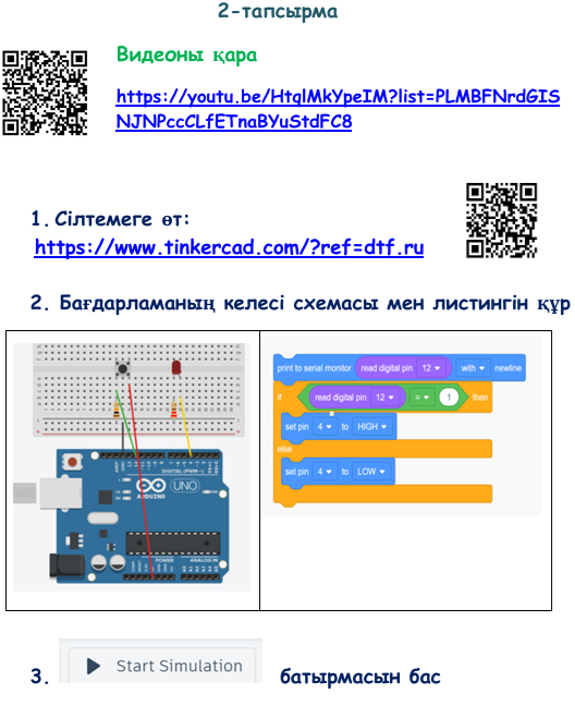 Оқушылар топтарға бөлінеді, тапсырманы топпен орындайды Дескрипторлар: - интерактивті тапсырмаларды орындайды - видеоны қарайды - бағдарламада тіркеледі - схеманы құрастырады - бағдарлама кодын құрастырады - схеманы құрастырады - бағдарлама кодын құрастырады