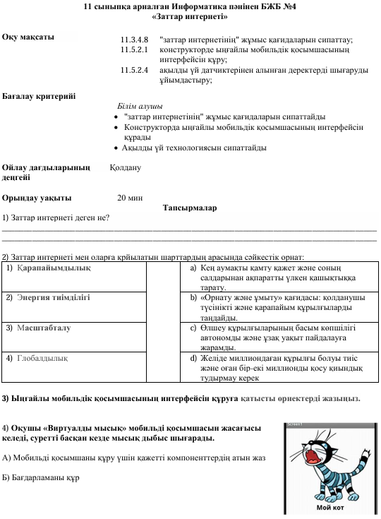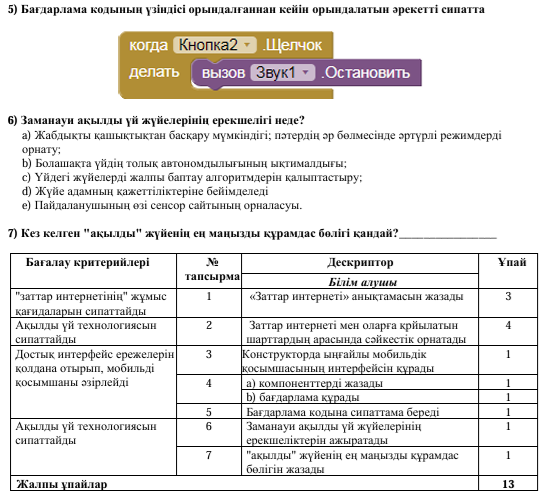 Оқушылар топтарға бөлінеді, тапсырманы топпен орындайды Дескрипторлар: - «Заттар интернеті» анықтамасын жазады - Заттар интернеті мен оларға қрйылатын шарттардың арасында сәйкестік орнатады - Конструкторда ыңғайлы мобильдік қосымшасының интерфейсін құрады а) компоненттерді жазады b) бағдарлама құрады - Бағдарлама кодына сипаттама береді - Заманауи ақылды үй жүйелерінің ерекшеліктерін ажыратады "ақылды" жүйенің ең маңызды құрамдас бөлігін жазады |