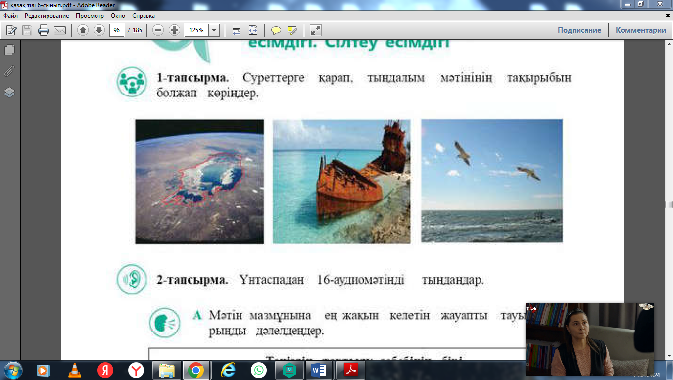 6.1.5.1 - тыңдалған мәтін мазмұны бойынша жалпы және нақты сұрақтарға жауап беру, мәтіндегі ақпаратты шынайы өмірмен байланыстыру. 6.4.4.1 - сөйлемдегі есімдіктің қызметін түсіну, есімдікті зат есім, сын есімнің орнына қолдану; |
