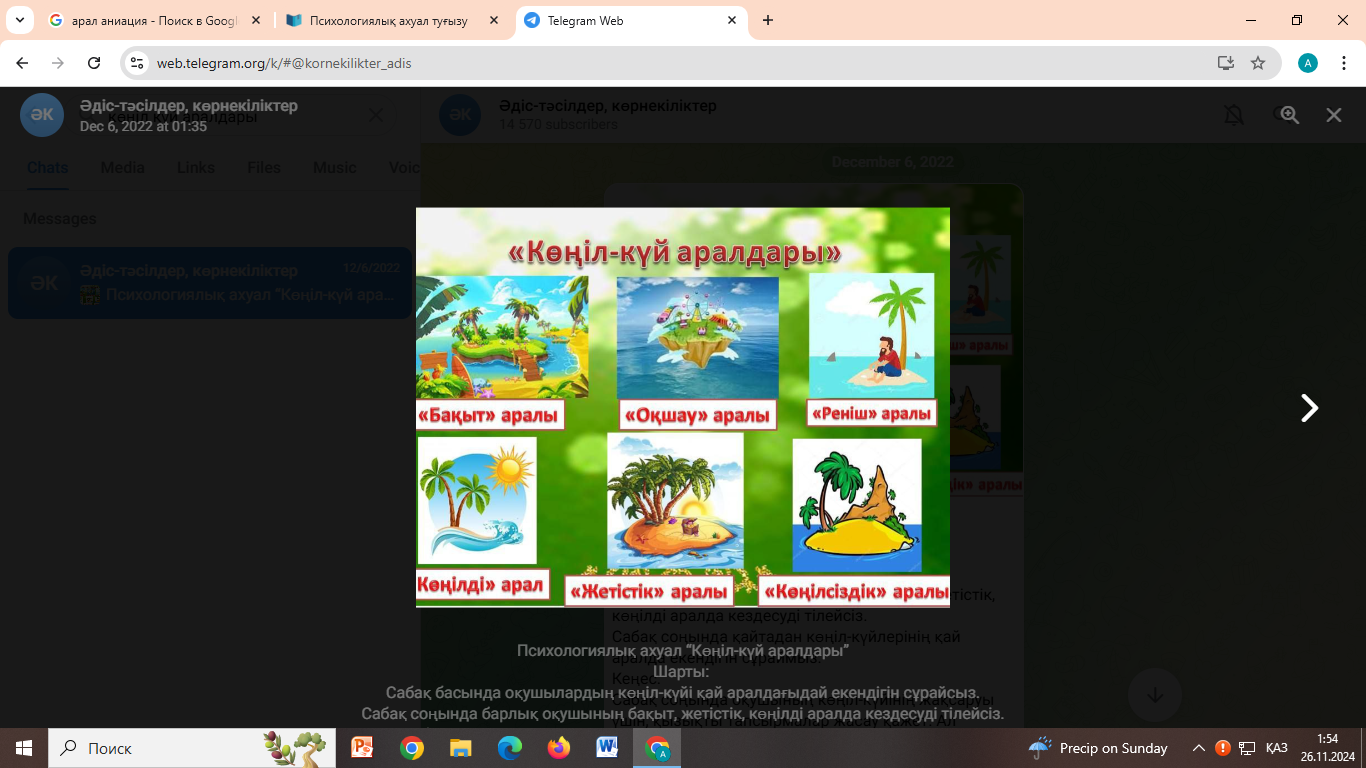 Ұйымдастыру кезеңі. Сәлемдесу; Оқушыларды түгелдеу. Ынтымақтастық атмосферасын қалыптастыру үшін «Көңіл күй аралдары»: