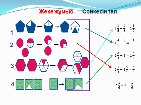 5.1.2.19 натурал саннан жай бөлшекті азайтуды орындау 5.1.2.20 аралас сандарды қосу және азайту амалын орындау |