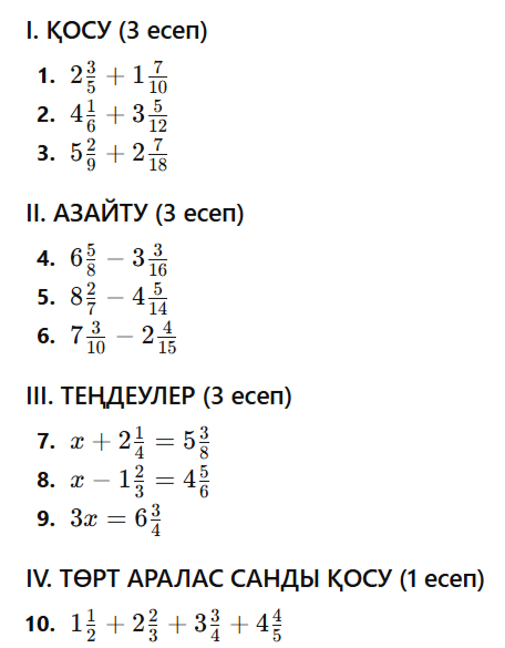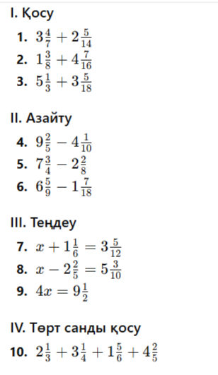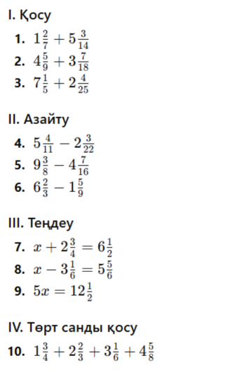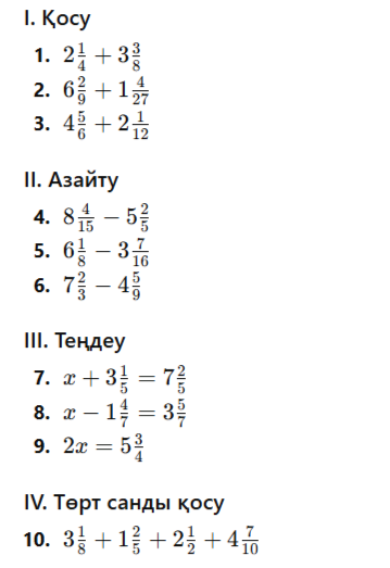 5.1.2.19 натурал санға жай бөлшекті қосуды орындау; 5.1.2.20 аралас сандарды қосуды орындау |