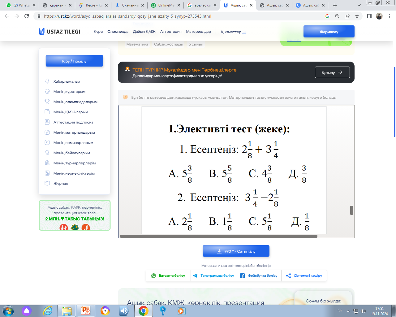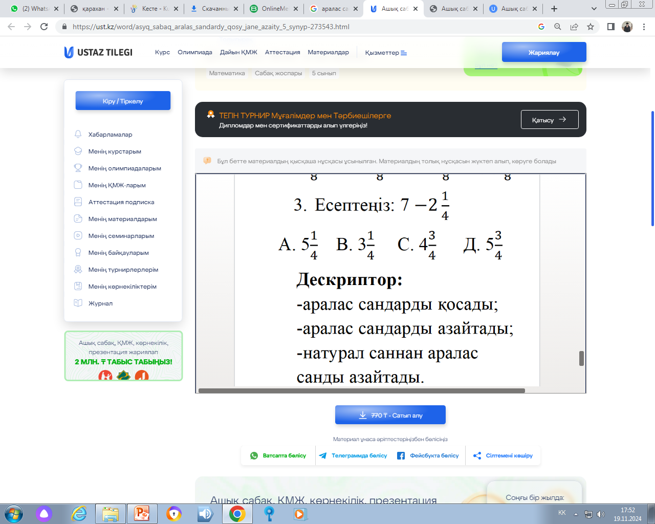Дескриптор: Бөлімдері әр түрлі аралас сандарды қосады; Бөлімдері бірдей аралас сандарды қосады; Аралас саннан натурал санды азайтады; Жалпы балл: 2 балл |