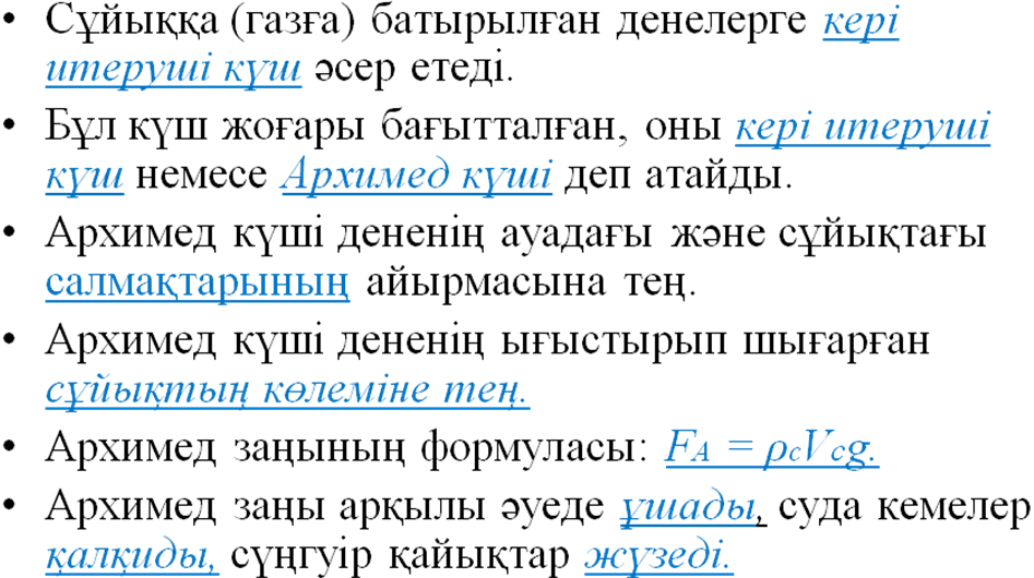 Архимед заңы –закон Архимеда-Archimedes’ principle Судың тығыздығы – плотность воды - density of water Кері итеруші күш – Выталкивающая сила - buoyant force Дененің көлемі – Обхем тела - volume of the body |