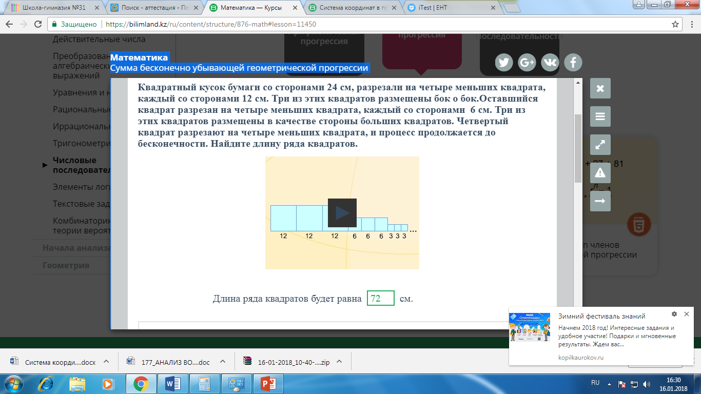 Учащиеся применяют формулу бесконечно убывающей геометрической прогрессии в геометрии Формативное оценивание через наблюдение, уточняющие вопросы. Внесение баллов в лист оценивания. |