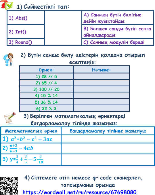 Топтарға бөлінеді, тапсырманы топта орындайды Дескрипторлар: - сәйкестікті белгілейді - кестені толтырады - өрнектерді программалау тіліне аударып жазады; - интерактивті тапсырманы орындайды; Көз жаттығуларын орындайды - бағдарламаның орындалу нәтижесін жазады - бағдарламадағы бос орындарды толтырады; - бағдарлама жазады, нәтижесіне талдау жасайды |