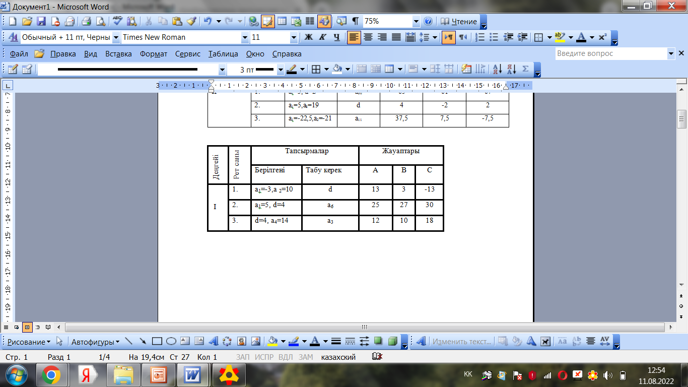 an=a1+(n-1)d a7=3+6*4 = 27 Тақтадағы жауап бойынша жұптық жұмыс арқылы бір-бірлерін тексереді |