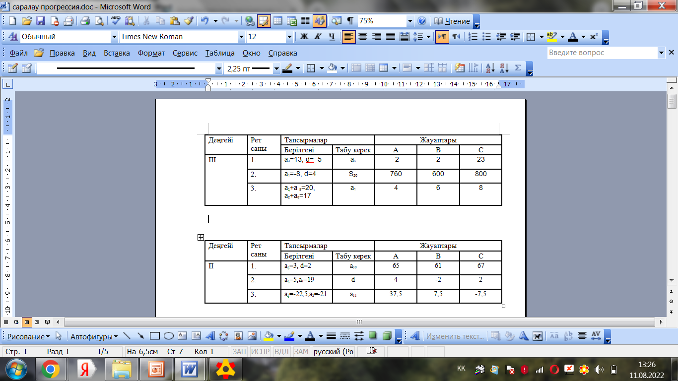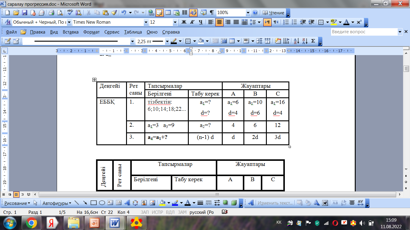 арифметикалық прогрессиялардың n-ші мүшесін, алғашқы n мүшелерінің қосындысын, сипаттамалық қасиет формулаларын біледі және есептер шығаруда қолданады. |
