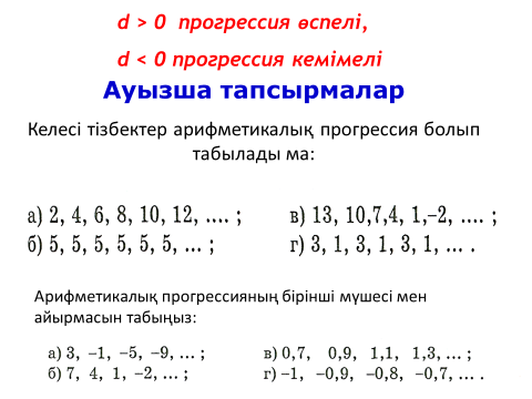 d > 0 прогрессия өспелі, d < 0 прогрессия кемімелі