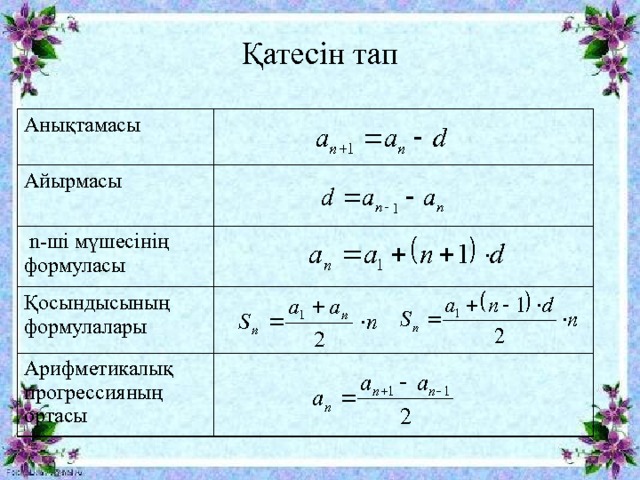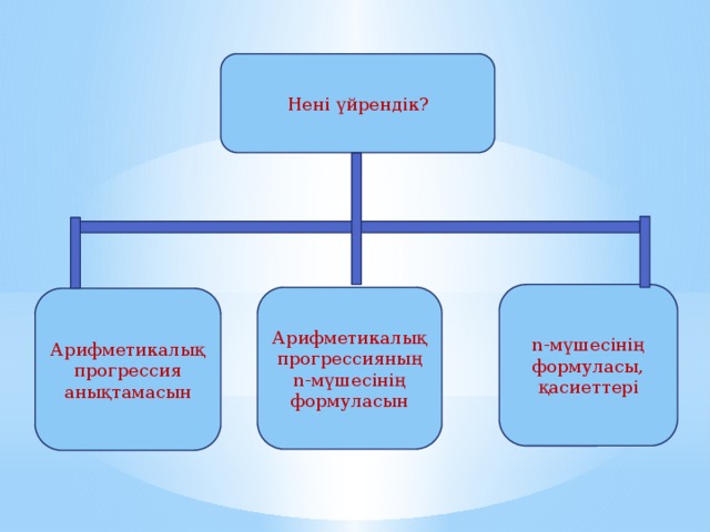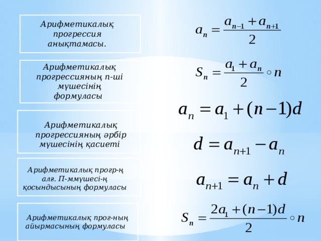 Арифметикалық прогрессия мен арифметикалық прогрессияның n-ші мүшесінің формуласы есептер шығаруда пайдаланады |