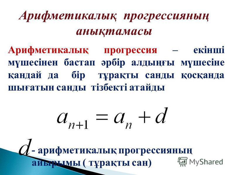 Анықтама. Екінші мүшесінен бастап әрбір мүшесі алдыңғы мүшесіне қандайда бір тұрақты санды қосқанда шығатын сандар тізбегін арифметикалық прогрессия деп атайды. Қосылатын тұрақты сан, кез келген көршілес екі мүшесінің (алдыңғы және кейінгі ) айырымы екенін байқауға болады. Бұл санды арифметикалық прогрессияның айырымы деп атап, d әрпімен белгілейді.