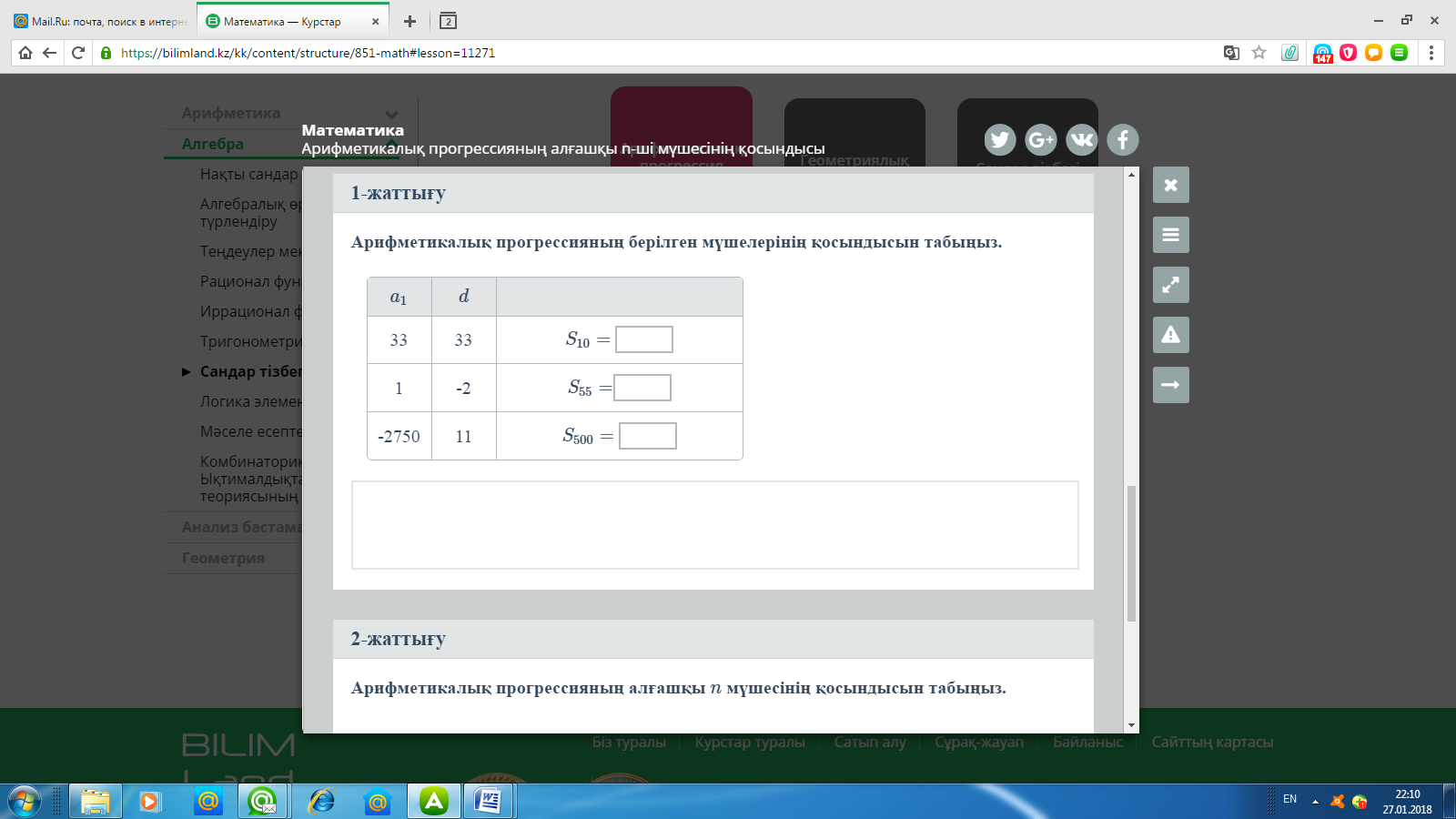 Арифметикалық прогрессияның n-ші мүшесінің формуласын пайдаланып, арифметикалық прогрессияның алғашқы n мүшесінің формуласын жаз: Сілтеме:https://bilimland.kz/kk/content/structure/851-math#lesson=11271