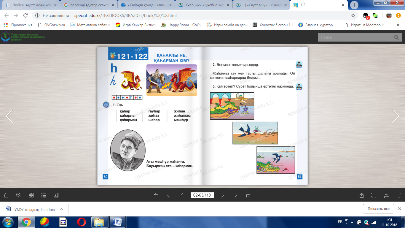 Пазлдар Таныстырылым, оқулықпен жұмыс Бауыржан Момышұлы жайлы видеоролик Дәптермен жұмыс |