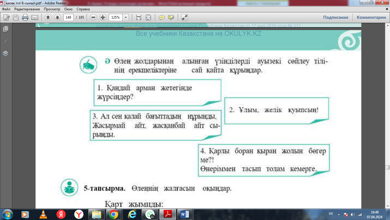 6.2.4.1- ауызекі және ресми стильдегі мәтіндердің тақырыбын, мазмұнын, тілдік ерекшелігін салыстыру; |