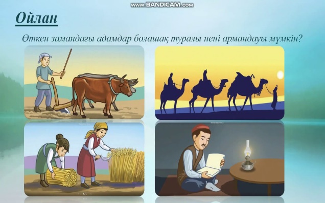 Жаңа сабақты түсіндіру ТЖ «Суреттер сөйлейді» әдісі Өткен замандағы адамдардың болашақ туралы арманын тауып постер құрайды. 1 топ- егін 2 топ – керуен 3 топ – егін 4 топ – жарық Автор туралы мәлімет беру Бүркіт Ысқақов – ақын. Қарағанды обл. Нұра ауд. Көкмөлдір ауылында дүниете келген. ЖЖ. «Стоп кадр» әдісі Қанатты қиял өлең шумақтарын кезек пен кезек оқу. Дәптермен жұмыс. Сөздікті дәптерге көшіріп жазу. Шер тарқату – әңгіме айту Сергіту сәті «Қораптағы сөз» әдісі Қорапта жасырылған сөзді өз тобына 10 сек. ішінде жасыру керек. ЖЖ. «Иә/ Жоқ» әдісі Берілген тұжырымдардың дұрыс, бұрыстығын орындайды