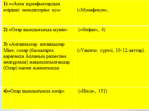 4. «Қиямет күні кей беттер ағарып, кей беттер қараяды. Сонда қара беттерге: Иман келтіргеннен кейін қарсы келдіңдер ме? Ендеше қарсы келулерің себепті азапты татыңдар делінеді» осы аят кімдерге қатысты айтылған?