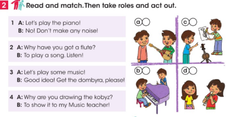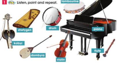 Children will listen and repeat. Kobyz Zhetygen Dombyra Drum Violin Drum Tombourine Piano Flute |