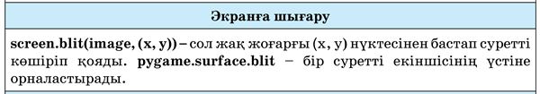 1 мысал import pygame pygame.init() screen=pygame.display.set_mode((700,300)) jaulay_suf=pygame.image.load('1.jpg') jaulay_suf.set_colorkey((255,255,255)) jaulay_rect=jaulay_suf.get_rect(center=(200,150)) screen.blit(jaulay_suf,jaulay_rect) bala_surf=pygame.image.load('2.png') bala_rect=bala_surf.get_rect(bottomright=(600,330)) screen.blit(bala_surf,bala_rect) pygame.display.update() wpygame.display.update() running=True while running: for event in pygame.event.get(): if event.type==pygame.QUIT: running= False |