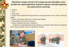 - Әскери тәртіп сақтау бойынша әскери қызметшілердің міндеттерін біледі |