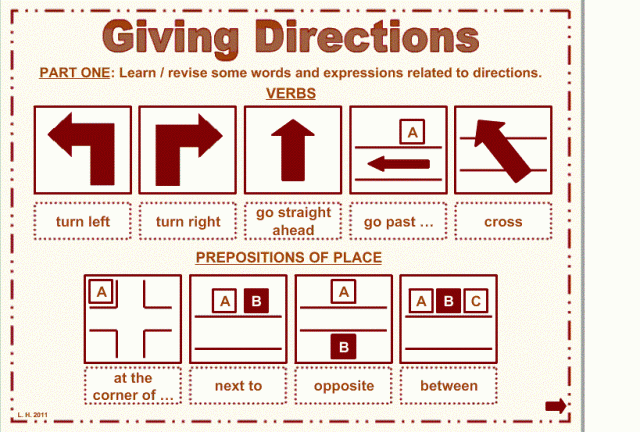 Repeat phrases. Practice pronunciation. Copy phrases. Listen carefully. Match questions and answers. Identify speaker’s opinion (helpful/not helpful). Create dialogue. Use map. Perform in front of class. |