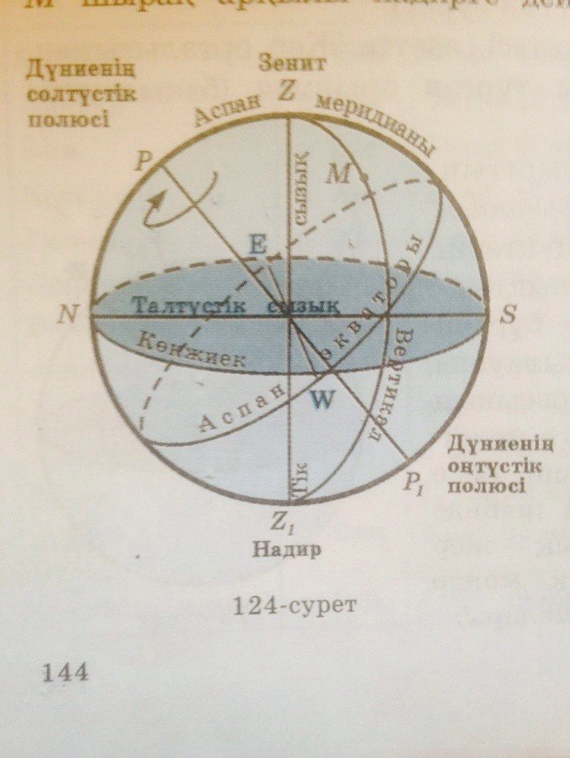 Аспан экваторы аспан сферасын оңтүстік және солтүстік екі жарты шарға бөледі және көкжиекпен екі нүктеде қиады. Нүктенің бірін ата.(шығыс (Е))