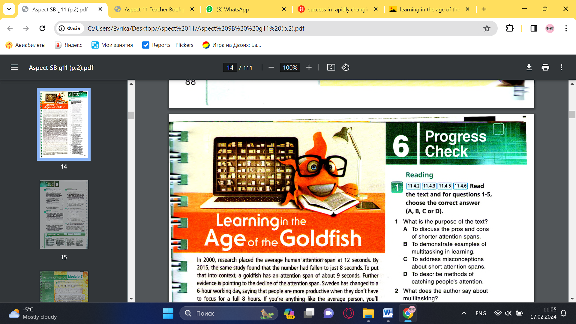 •Pupils read the text and for question choose the correct answer. ANSWERS 1 C ("The goldfish comparisons certainly seem to suggest that, but it's not really the case.") 2 D ("74% of millennials use their mobile phone while watching TV) 3 B 4 D ("The days of forcing people to sit and learn for long periods are gone, learning must be flexible, easily accessible, and at a pace best suited for the learner") 5 A ("The age of the goldfish is not an age of stupidity, but one of change. With change comes new opportunities...") •Pupils will hear two friends discussing effect of globalisation on languages. Write B if both speakers agree, C for Catherine, D for Donald. ANSWERS 1 C 2 B 3 B 4 C 5 D •Pupils choose the correct item. ANSWERS 1 rewarding 2 radical 3 facilitates 4 retention 5 instil |