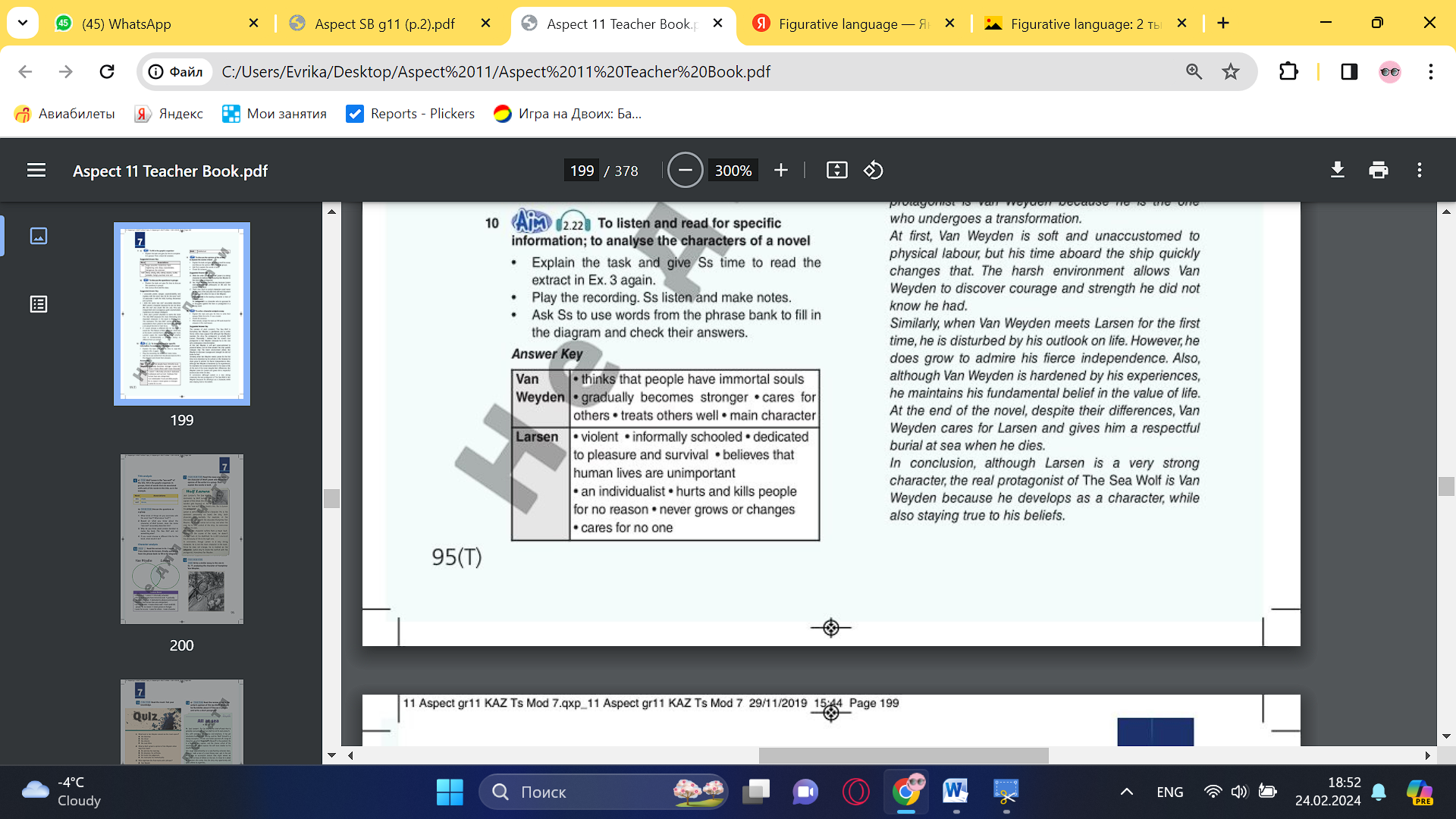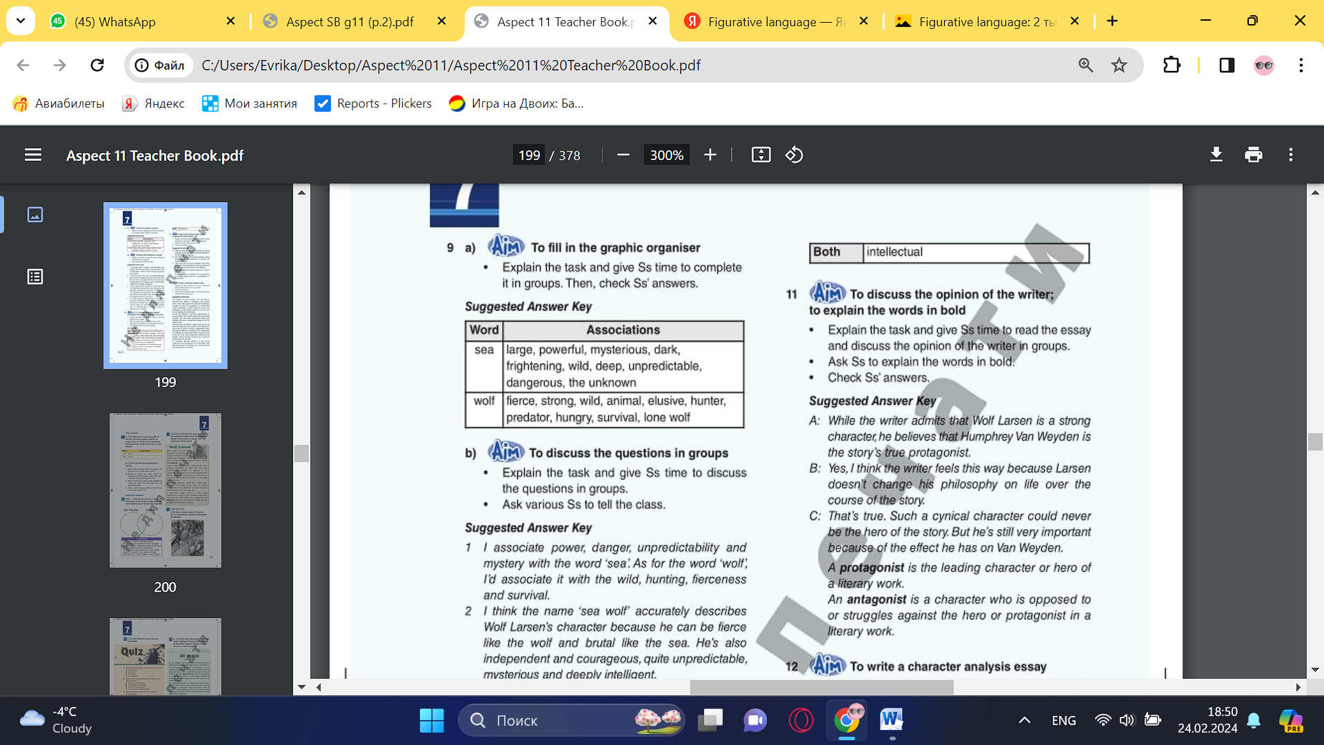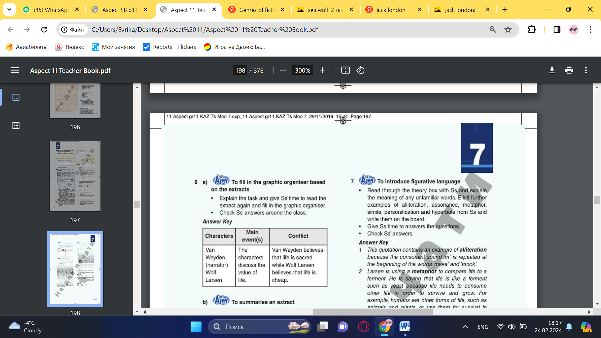 •Pupils read the biography and answer the questions. ANSWERS 1 Jack London was born in 1876 in San Francisco, California. 2 He could afford to go to university because a local business owner gave him the money. 3 He went to the Klondike region to look for gold. 4 His first successful piece of writing was a story that a magazine published and paid him a small amount of money for. 5 He is best known for the novels The Call of the Wild, The Sea Wolf and White Fang. •Pupils read the summary of the novel and mark the statements ANSWERS 1 F (... a wealthy intellectual man named Humphrey Van Weyden...) 2 T ('Wolf enjoys talking to Van Weyden, however, because they're both intellectuals!) 3 F ('Wolf is incapacitated with a terrible headache!) 4 T ('He dies shortly thereafter, and they bury him at sea. Later, they are rescued!) 5 T ('The Sea Wolf received some criticism for its overall narrative structure') •Pupils read to find out. ANSWERS Humphrey Van Weyden and Wolf Larsen are discussing the value of life. •Pupils read the extract again and for question choose the correct answer. ANSWERS |