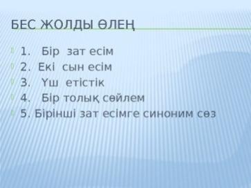 Дескриптор:3 балл - Мәтіннен деректі және дерексіз зат есімдерді табады; - зат есімдерді пайдаланып, сөйлем құрап жазады; -қатесіз жазады;