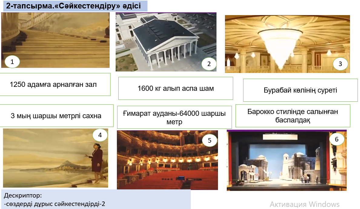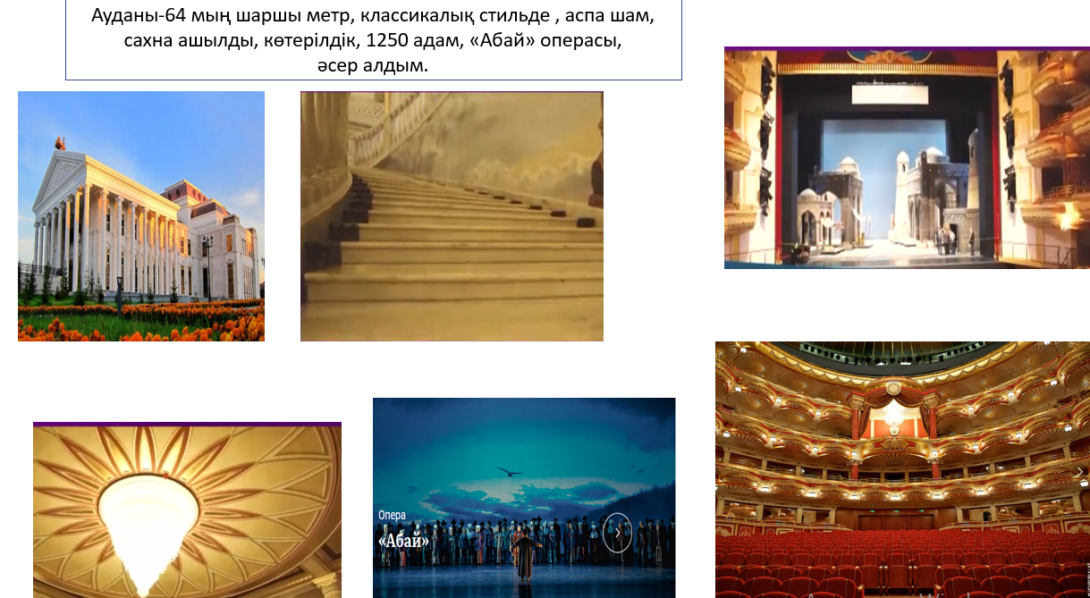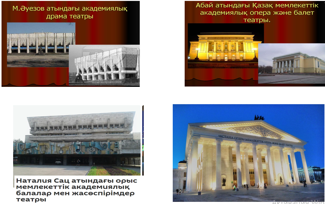 Мәтін алды жұмыс. ҰЖ. Оқушылар суреттер бойынша жетекші сұрақтарға жауап береді. 1/Сендер қандай театрларды білесіңдер? 2/Қай театрға бардыңдар? 3/Қандай қойылым көрдіңдер? Өз ойымен бөліседі. «Астана Опера» Мемлекеттік опера және балет театры