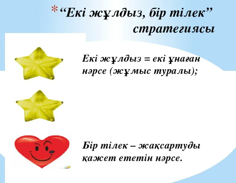 ҚБ: Өз ойын дұрыс мағынада білдіріп, талқылауға белсенділікпен қатысқан оқушыға «Жарайсың!» деген мадақтау сөзімен ынталандыру. |