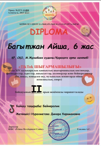 «АКВАРЕЛЬ» БЕЙНЕЛЕУ ӨНЕРІ ХАЛЫҚАРАЛЫҚ БАЛАЛАР ОРТАЛЫҒЫ ДИПЛОМ Бағытжан Айша Азаматқызы |