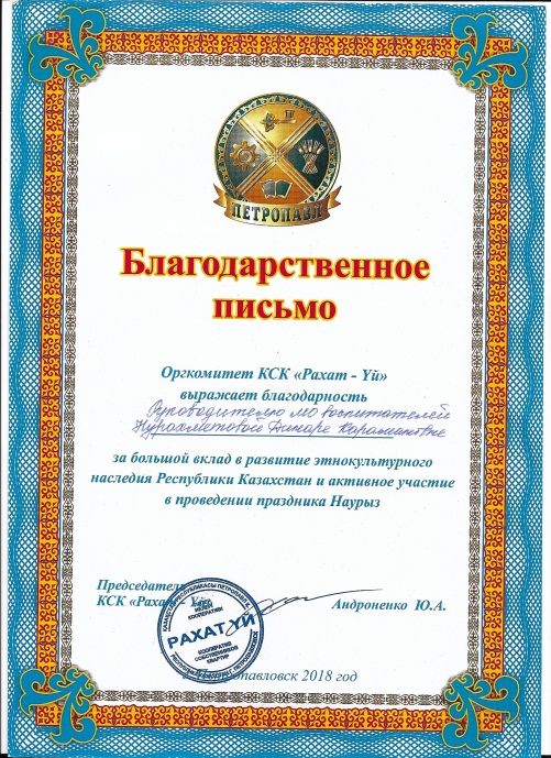 ОРГКОМИТЕТ КСК «РАХАТ ҮЙ» БЛОГОДАРСТВЕННОЕ ПИСЬМО за большой вклад в развитие этнокультурного наследия Республики Казахстан и активное участие в проведении праздника Наурыз