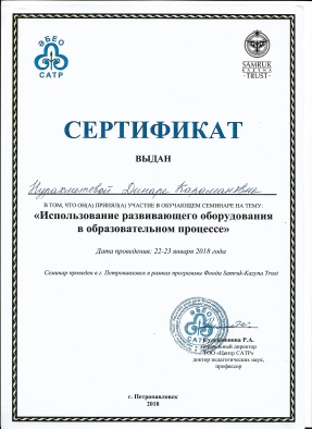 ҚАЗАҚСТАН РЕСПУБЛИКАСЫ БІЛІМ ЖӘНЕ ҒЫЛЫМ МИНИСТРЛІГІ САТР ОРТАЛЫҒЫ SAMRUK-KAZYNA бағдарламасы аясында СЕРТИФИКАТ 22.01- 23.01.2018 ж. аралығында «Білім беру процесінде дамытушы құралдарды қолдану» (36сағат) Тіркеу номері № 0390783 |