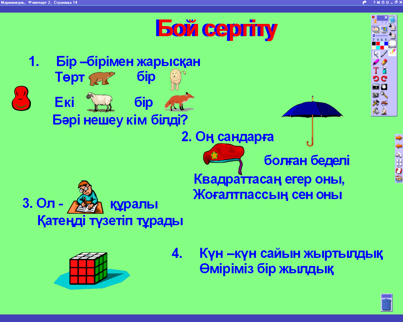 Көрнекілігі: Интерактивті тақта, компьютер, кеспе қағаздар