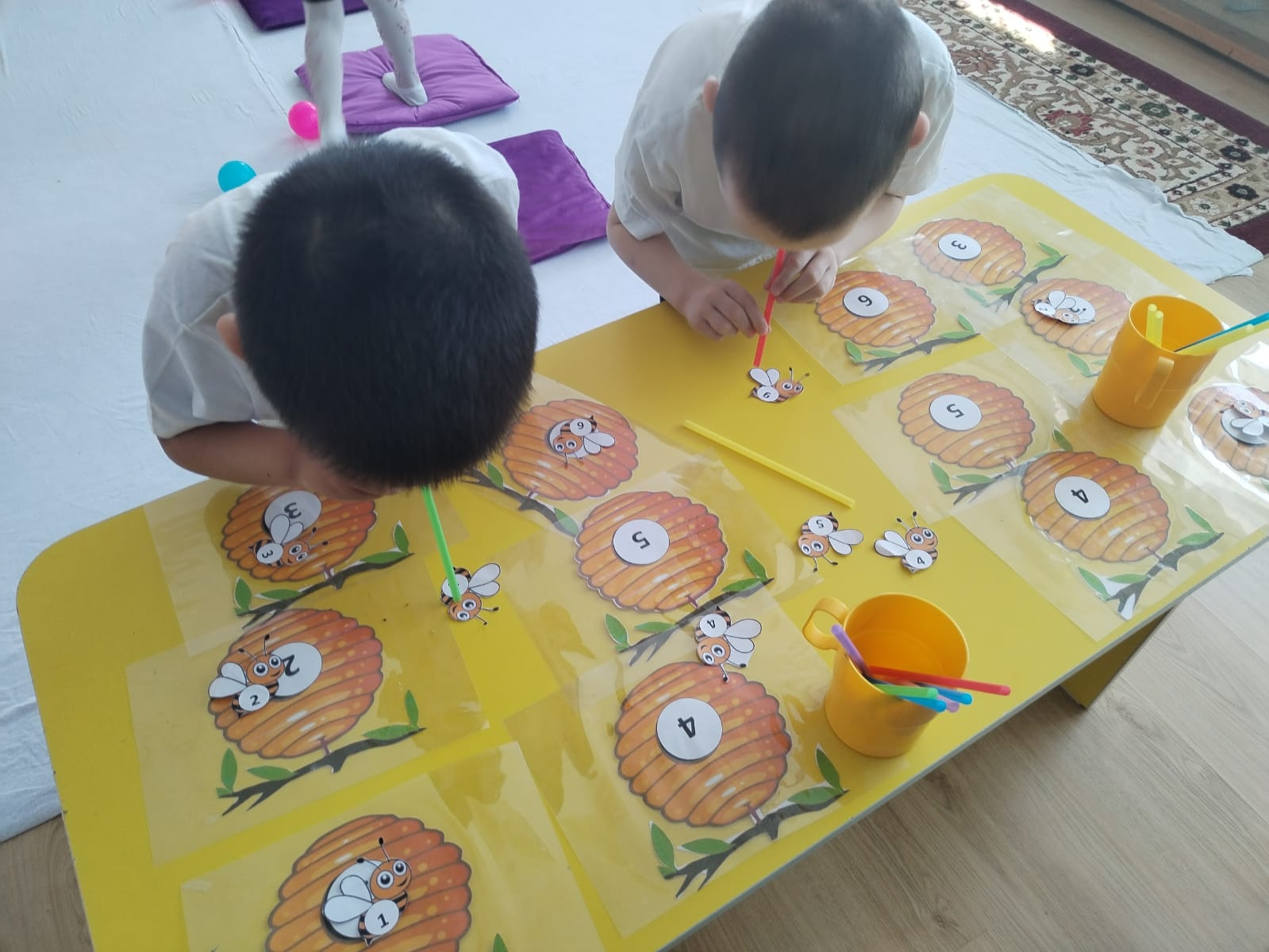 Ойын «Ара-ұясы» Балалар екі топқа бөлініп тұрады. Бір ойыншы кедергілерден өтіп үстелге барады. Үстел үстіндегі сандарды түтікше арқылы тиісті араның ұясына салады.