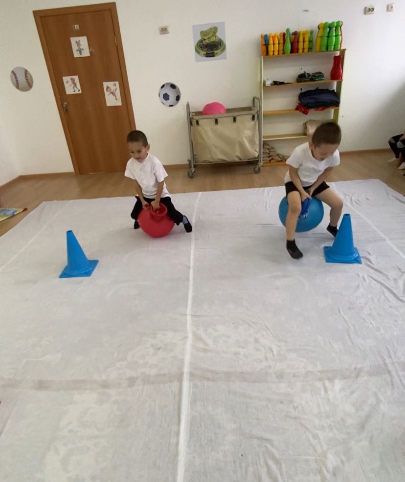 Шарты: Екі бала үрленген шармен шабандоз кеіпінде қолындағы шеңберді лақтырып конуссқа ілу керек.