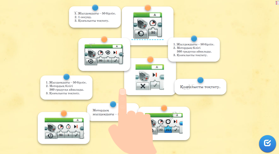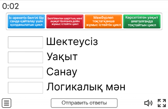1. Бағдарлама қандай цикл режимі қолданылады? 2. Бағдарламаны орындау кезінде роботтың қозғалысы алгоритмі қандай? 3. Егер біз бағдарламадағы циклды режимдерге өзгертсек, Робот қозғалысында не өзгереді уақыт және шектеусіз? Ал енді біз электронды оқулықтағы тапсырмаларды орындаймыз. Барлығымыз компьютерлерімізді ашып, берілген тапсырмаларды орындаймыз. Егер сұрақтар болса, қол көтеріп сұрауларыңа болады. Барлығы аяқтаған соң, біз бірге тексеріп, талқылаймыз. Сергіту сәті