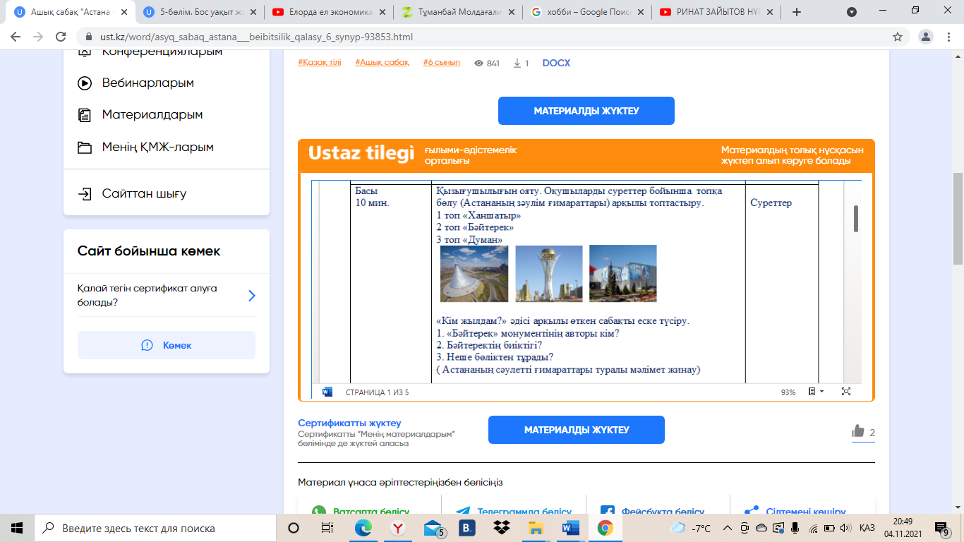«Кім жылдам?» әдісі арқылы өткен сабақты еске түсіру. 1. «Бәйтерек» монументінің авторы кім? 2. Бәйтеректің биіктігі? 3. Неше бөліктен тұрады? Астананың сәулетті ғимараттары туралы мәлімет жинаңдар.