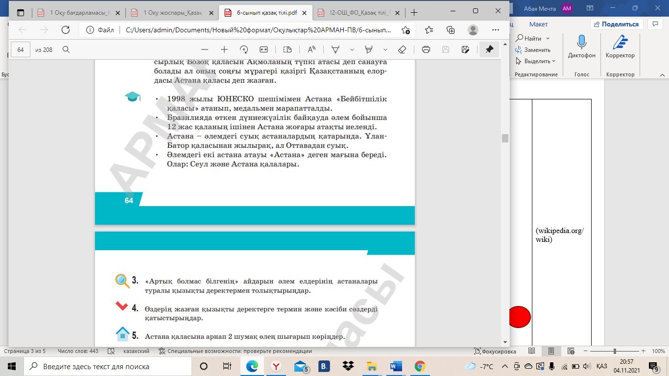 •Артық болмас білгенің» айдарын әлем елдерінің астаналары туралы қызықты деректермен толықтырады; •қызықты деректерге термин және кәсіби сөздерді қатыстырады.