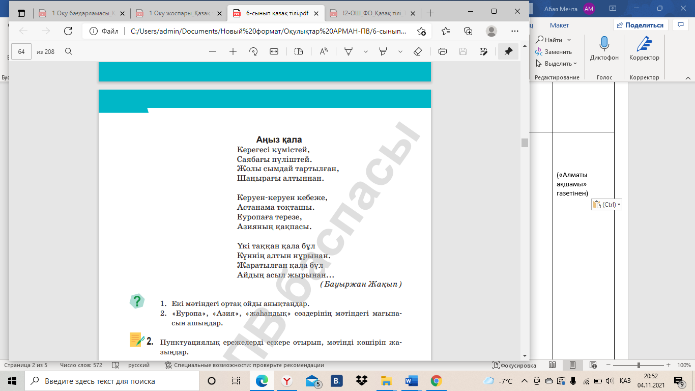 1. Екі мәтіндегі ортақ ойды анықтаңдар. 2. «Еуропа», «Азия», «жаһандық» сөздерінің мәтіндегі мағынасын ашыңдар Дескриптор: