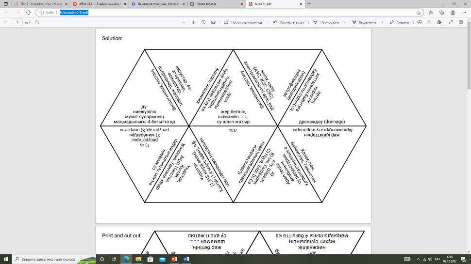 Қызығушылықты ояту Топтар тарсиа мейкер жаттығуы арқылы, сұрақтардың жауабын таба отыра, түрлі фигулалар құрастырады Әрбір топ фигура ішінен бірнеше ақпаратты оқиды Бағалау: өзін-өзі тексеру (презентациядағы жиналған дұрыс фигура және дұрыс сәйкестіктер көрсетіледі)
