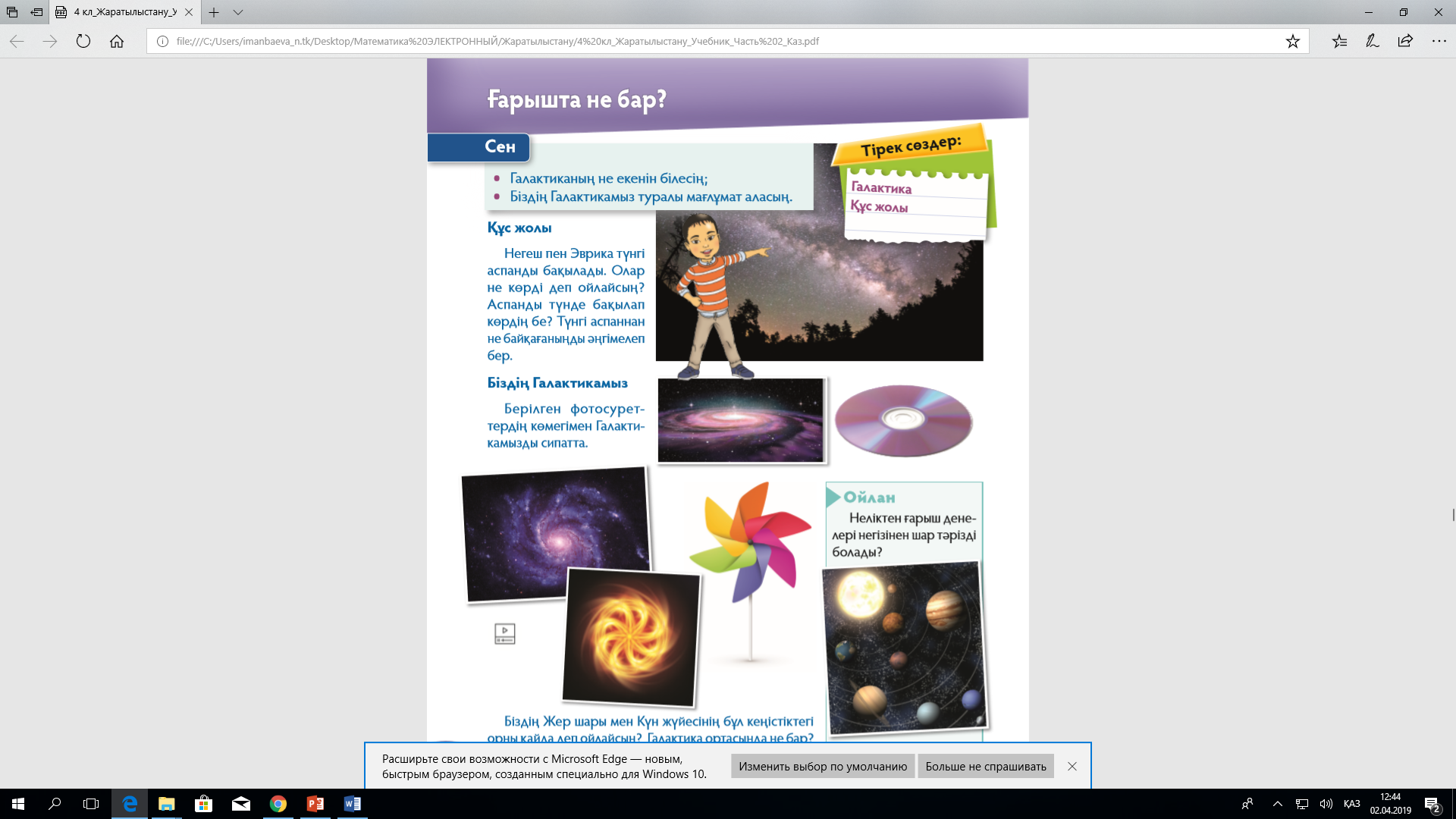 Аспанмен тілдесу -Балалар, айналамызды қарап көрейікші, үстіміздегі киім ше? Бүгін жаратылыстану пәнінен не істейтінімізді тауып көрейік. -Дұрыс, бүгін біз тек оқушы емес, ғарышкер, зерттеушілер боламыз. -Сабағымыздың тақырыбы Ғарышта не бар? Оқу мақсатымыз 4.4.3.1Жердің орбиталық айналуының салдарын түсіндіру -Бүгін біз сіздермен космосқа ұшамыз. Бірақ біздің ғарыш кемемізді іске қосу үшін тапсырма орындау керек. Үй тапсырмасы. -Бізге Froggy Jumps өткен тақырып бойынша бізге тест тапсырмаларын дайындап қойыпты. -Алдарыңда тұрған дескриптор бойынша жұмыс жасап, қалыптастырушы бағалауға балл қойып отырамыз. -1961 жылдың 12 сәуір күні не болғаның маған кім айтады? -дұрыс айтасыңдар, сол күні, «Восток» ғарыш кемесінде қобалжып отқан Гагарин атамыздан командир сұрайды дайынсың ба деп? Сол кезде ең алғашқы ғарышкер -Поезали! Деп жауап береді. Ал сендер, балалар! Дайынсыңдар ма? -ПОЕХАЛИ! https://youtu.be/F-A2ShK6Cmc?si=lPXzBRHrXBLoUG9y https://youtu.be/0FAdGk9uKJo?si=umAlko5ozDPGYueI Жаңа тақырып Жедел сұрақ (2 минут) Ғарышта не бар? Аспанды түнде бақылап көрдің ба? Аспандағы ақ күміс түсті жолақты байқадыңдар ма? Олар қалай аталады? құс жолы Білетін балалар оның жұлдыздардың шоғыры екенін айтуы мүмкін. Ол не болуы мүмкін? Біздің галактика қандай пішінде? Біздің галактика (2 минут) Оқушылардың бір тобына диск, екінші тобына вертушка немесе спираль тәрізді қиылған қағаз таратып беру. Әр топқа галактика осы затқа ұқсайды деп айтыңыз. Әр топтан бір-бір бала өз заты бойынша галактиканы сипаттайды. Біздің галактика осы заттарға ұқсайды. Ендеше жер ғаламшары орналасқан галактиканы сипаттайық